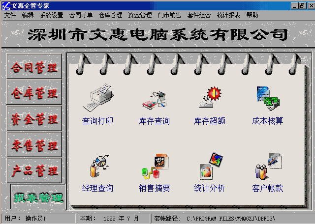 《企管专家》是文惠公司于1999年10月在长达数月的产品测试后隆重推出的、运行在 Windows98/NT 下的新型管理软件产品。该产品继承了《文惠进销存系统》的各项优点,并在许多方面(例如:操作界面、功能集成、统计报表、运行速度、填写单据的产品实时库存显示等方面)给以发扬光大,完全接收原《文惠进销存系统》数据。